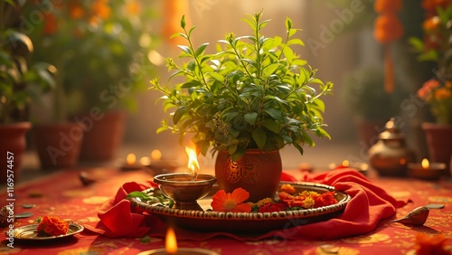 Spiritual Tulsi Plant Puja Ceremony with Diyas and Flowers