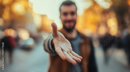 An image of a man extending his hand, inviting others to join or follow.