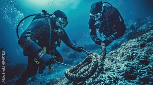 Underwater Divers Working Together on a Large Rope