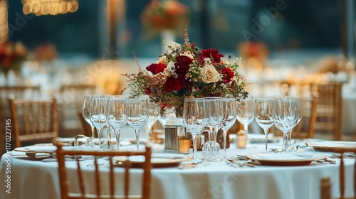 Elegant Wedding Reception Table Setting with Red and White Roses