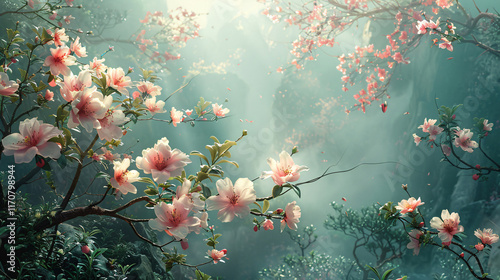 Burst of spring, blooming flowers and vibrant greenery, awakening of nature, clear blue sky, refreshing and lively, AI Generative