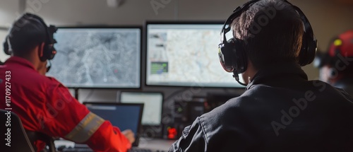 A firefighter team coordinating an evacuation during an emergency situation, showcasing teamwork and safety measures in action.