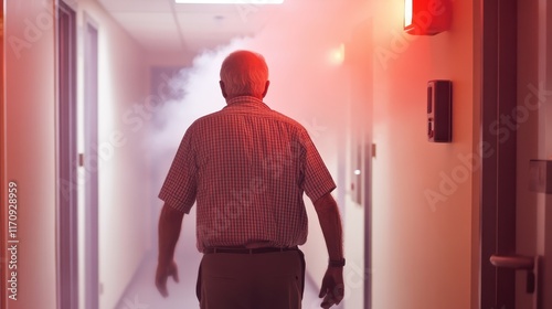 An elderly man is being assisted down a smoky corridor during a fire emergency, highlighting themes of safety and rescue.