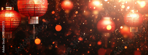 Red lanterns hang delicately in the air, casting a warm glow against a dark background. Shimmering lights twinkle around the lanterns, creating an enchanting atmosphere of celebration and happiness