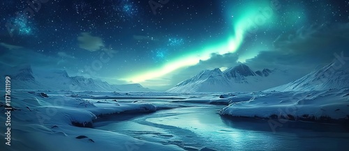 A beautiful northern lights sky over the frozen Icelandic tundra with snow-covered mountains in the background.