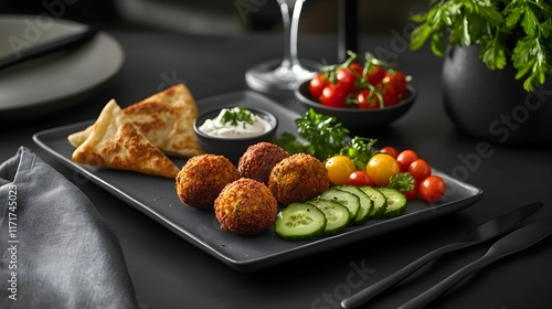 falafel, kuchnia bliskowschodnia, tahini, ciecierzyca, chrupiące, świeże warzywa, ogórek, pomidorki koktajlowe, rzepa kiszona, chleb pita, cytryna, minimalistyczne tło, szary kamień, naturalne światło