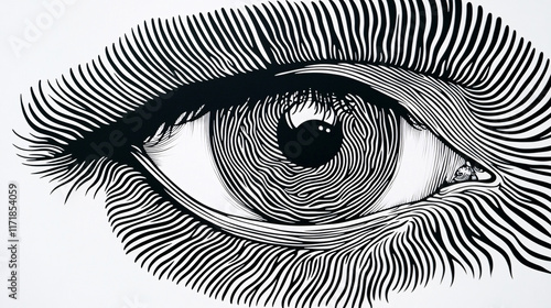 artistic black and white illustration of a highly detailed human eye with intricate linework and fine textures