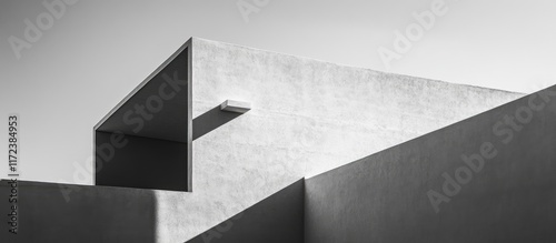 Contemporary office building architecture creating a striking house-shaped shadow against a bright sky in monochrome tones