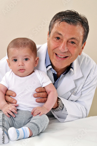 Feliz pediatra examinando a un bebe. Retrato de un doctor y un bebe.