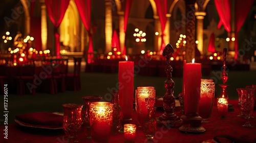 An extravagant wedding reception outside, featuring elegant seating, red-themed decor, and glowing candles for ambiance