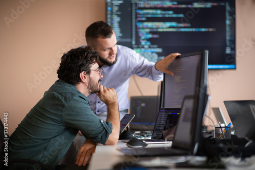 Programmers engrossed in deep collaboration, diligently working together to solve complex problems