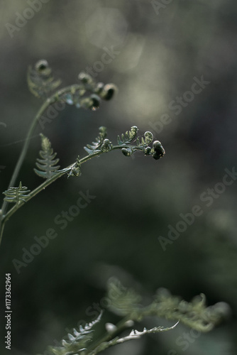 Rozwijający się liść paproci na rozmytym tle lasu. Bokeh. Leśna pocztówka.