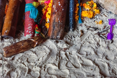Zbiór kolorowych drewnianych ofiar w postaci lingamów na tropikalnej plaży – duchowość i tradycja w tajskim rytuale