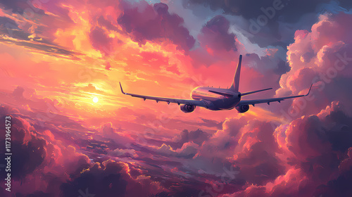 Skybound excitement: dramatic plane takeoff at colorful sunset. Skybound. Illustration