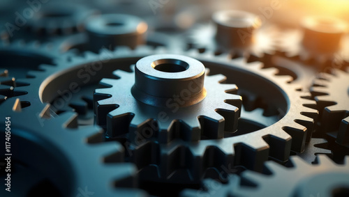 Makro-zdjęcie blokujących metalowych kół zębatych przedstawiające inżynierię, pracę zespołową i mechaniczną precyzję w środowisku przemysłowym.