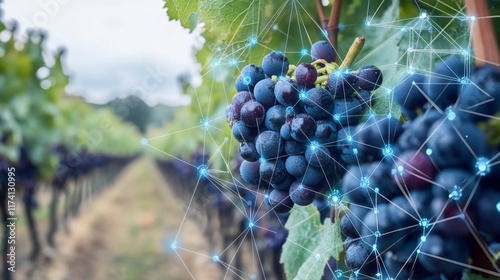 Smart vineyard technology, digital network overlay on ripe grapes.
