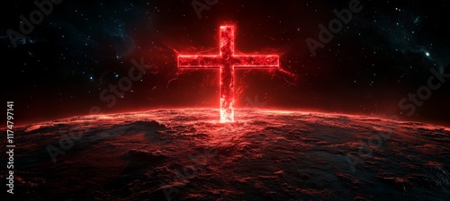 Glowing red Jesus Cross. Religion faith worship spirituality concept. Generative AI technology.