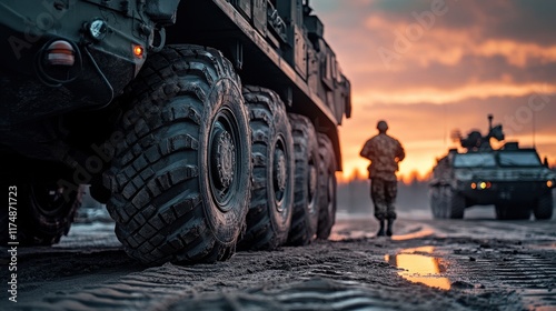 Silhouetted soldier observing military vehicles at sunset, highlighting resilience and strength.