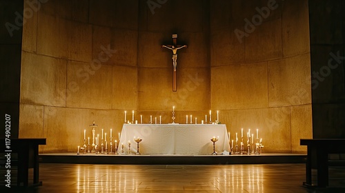 A serene altar with candles and a crucifix, creating a peaceful atmosphere for worship.
