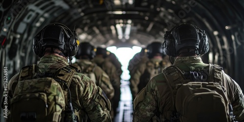 Soldiers in military aircraft, rear view.