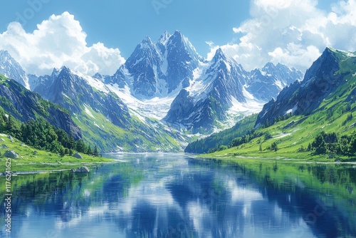 Stunning mountain lake reflecting peaks. Ideal for travel, nature, or serenity themes.