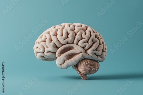 Detailed 3D Model of Human Brain Highlighted on Serene Blue Background Evoking Medical Research
