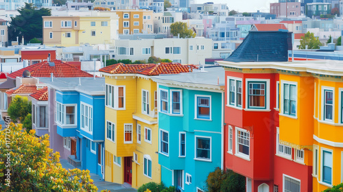 Kolorowe domy w malowniczym sąsiedztwie, ukazujące żywą architekturę i unikalne wzornictwo.
