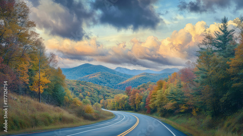 Droga biegnąca przez rozległe lasy i u podnóża potężnych gór, na tle dynamicznego, chmurnego nieba, tworzy spokojny i zachwycający krajobraz.