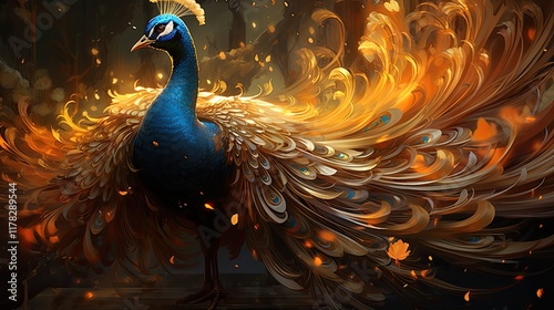 Un paon majestueux déploie sa queue flamboyante aux reflets dorés, évoquant une beauté mystique et une élégance surnaturelle.