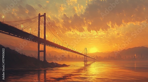 Sunset Bridge: Golden Hour Cityscape, Dramatic Impressionist Art
