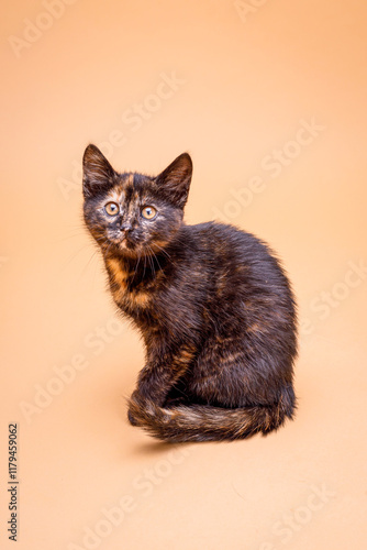 Młody kot, szylkretka, na jednolitym, beżowym tle.