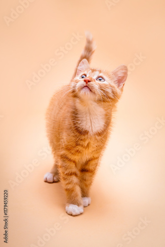 Rudy kot, mały kociak, stojący na czterech łapach na gładkim tle w odcieniu ciepłego beżu. Kot ma miejscowo białe futerko i uniesiony do góry ogon.