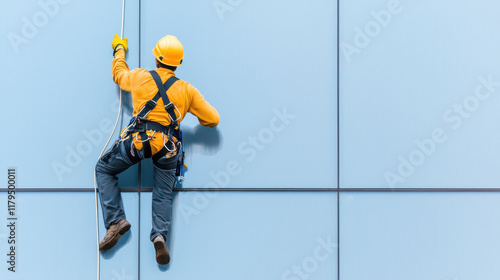 Clean the glass concept. worker suspended on harness cleaning exterior of building