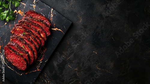 Sizzling Slices of Roasted Beef Steak on Dark Marble
