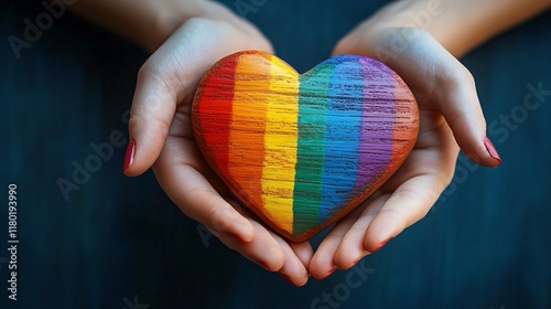 A vibrant, colorful wooden heart cradled in hands, symbolizing love and inclusivity, perfect for LGBTQ+ events, pride celebrations, and equality campaigns.