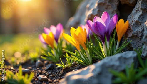 Crocuses spilling from a sunny rock crevice, a carpet of purple and yellow, garden, sun, yellow