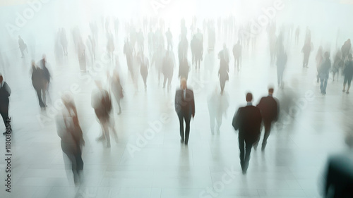 Mysterious Blurred Silhouettes of People Walking Through Misty White Space in Dreamy Style