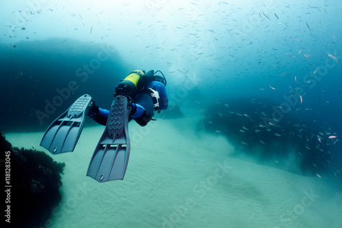 scuba diver in wetsuit and fins diving near sandy bottom of deep blue ocean with school of fish, concept of underwater adventure and active lifestyle