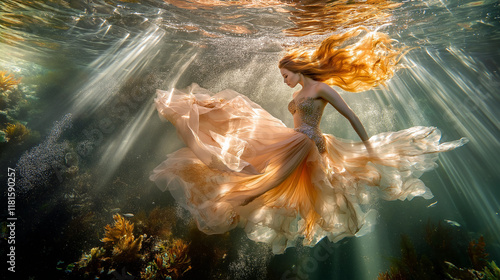 Faszinierende Unterwasseraufnahme einer mystischen Figur in elegantem Kleid