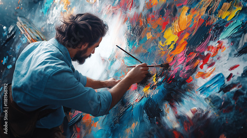 #1181886031Artist Painting Vibrant Abstract Artwork In Studio