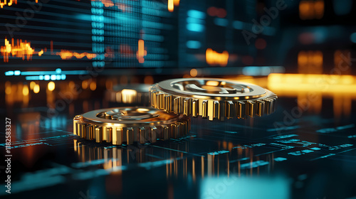 Market volatility concept. gold and silver gears mechanism with inscriptions market and volatility. 3d rendering. Velvetlight. Illustration