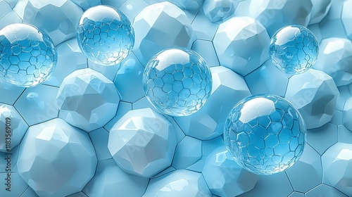 Abstract 3D rendering of light blue geometric shapes and translucent spheres.