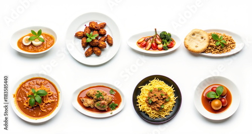 Jedzenie na białym tle. Pięknie skomponowane dania żywieniowe gotowe do wstawiania.