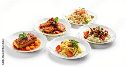 Jedzenie na białym tle. Pięknie skomponowane dania żywieniowe gotowe do wstawiania. Potrawy - jedzenie.