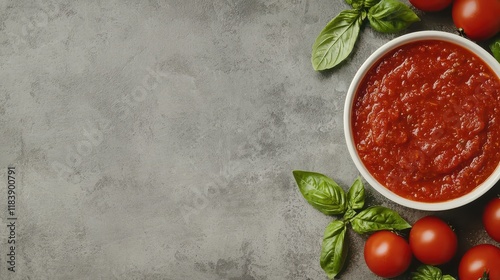 A vibrant bowl of tomato sauce surrounded by fresh basil leaves and ripe cherry tomatoes on a textured gray background.