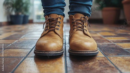 Tan Leather Boots on Tiled Floor Indoors