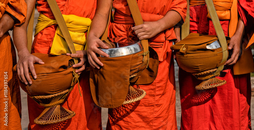 Buddhist monks in a line in Luang Prabang, Laos. Travel, Traditions and Culture