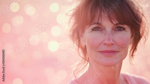 A serene portrait of a middle-aged Caucasian woman surrounded by soft, dreamy colors.