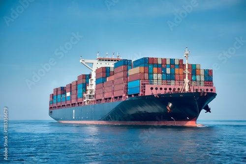 Cargo ship sailing on calm ocean, loaded with colorful shipping containers, clear blue sky, maritime transportation, global trade
