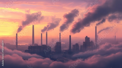Industrial skyline at sunset with smog and pollution rising from factories in a hazy atmosphere over urban landscape